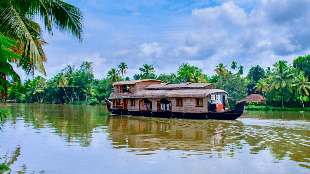 Glide through Kerala’s emerald backwaters on a traditional houseboat stay.